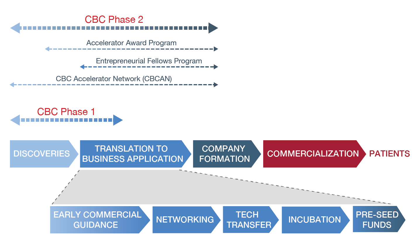 Launched in Spring 2019, the CBC Entrepreneurial Fellows program identifies and supports the professional development of academic biomedical researchers who are keen to develop the skills needed to move translational projects from a university lab towards commercialization. Working with CBC staff and faculty, Fellows will help develop and implement CBC-funded projects focused on translational research, including Accelerators. In addition, Fellows will support the diverse mechanisms through which CBC universities attempt to accelerate translation of their biomedical discoveries that have therapeutic and commercial potential. The CBC welcomed the first Entrepreneurial Fellow in April 2019: Eric Schiffhauer, PhD, who arrived to join the CBC from John Hopkins University. The second Entrepreneurial Fellow, Carissa Heath, PhD from Northwestern is expected to begin later this fall.